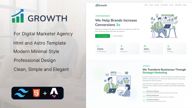 Growth is a professional Digital Marketing Landingpage Web Template built with Tailwind CSS and Astro Build