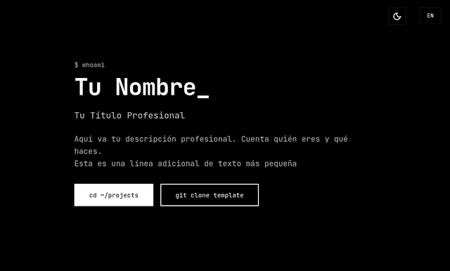 Minimalist tech portfolio template with terminal-inspired design, automatic dark/light mode, and bilingual support (Spanish/English). Features project showcase with filtering, image galleries, and SEO optimization.