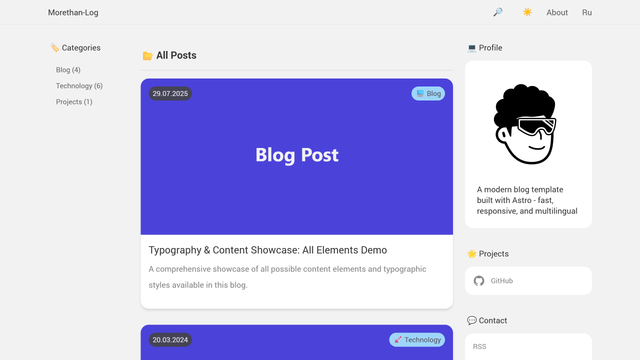 A modern, customizable blog template built with Astro. Features i18n support, dark mode, full-text search, PWA capabilities, and SEO optimization. Inspired by the popular morethan-log template for Next.js. Fork and start blogging in minutes!