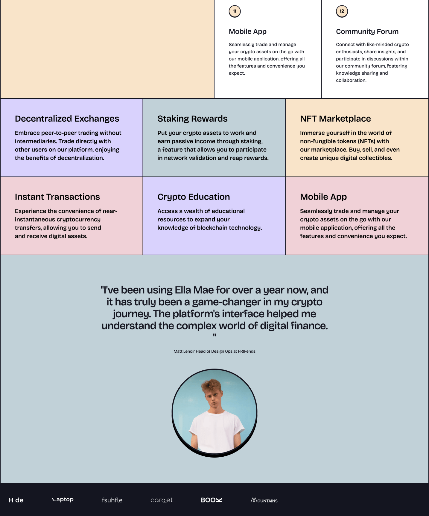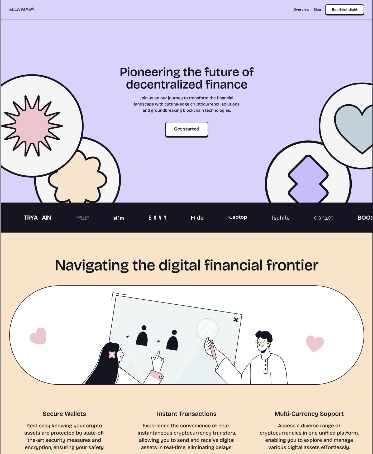 Ella Mae is a friendly, modern DeFi template with soft colors, strong structure, and thoughtful pages built for growing products.