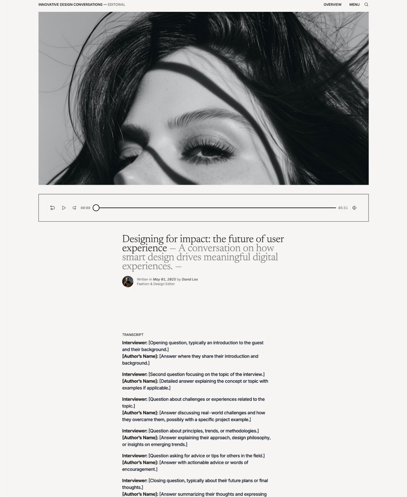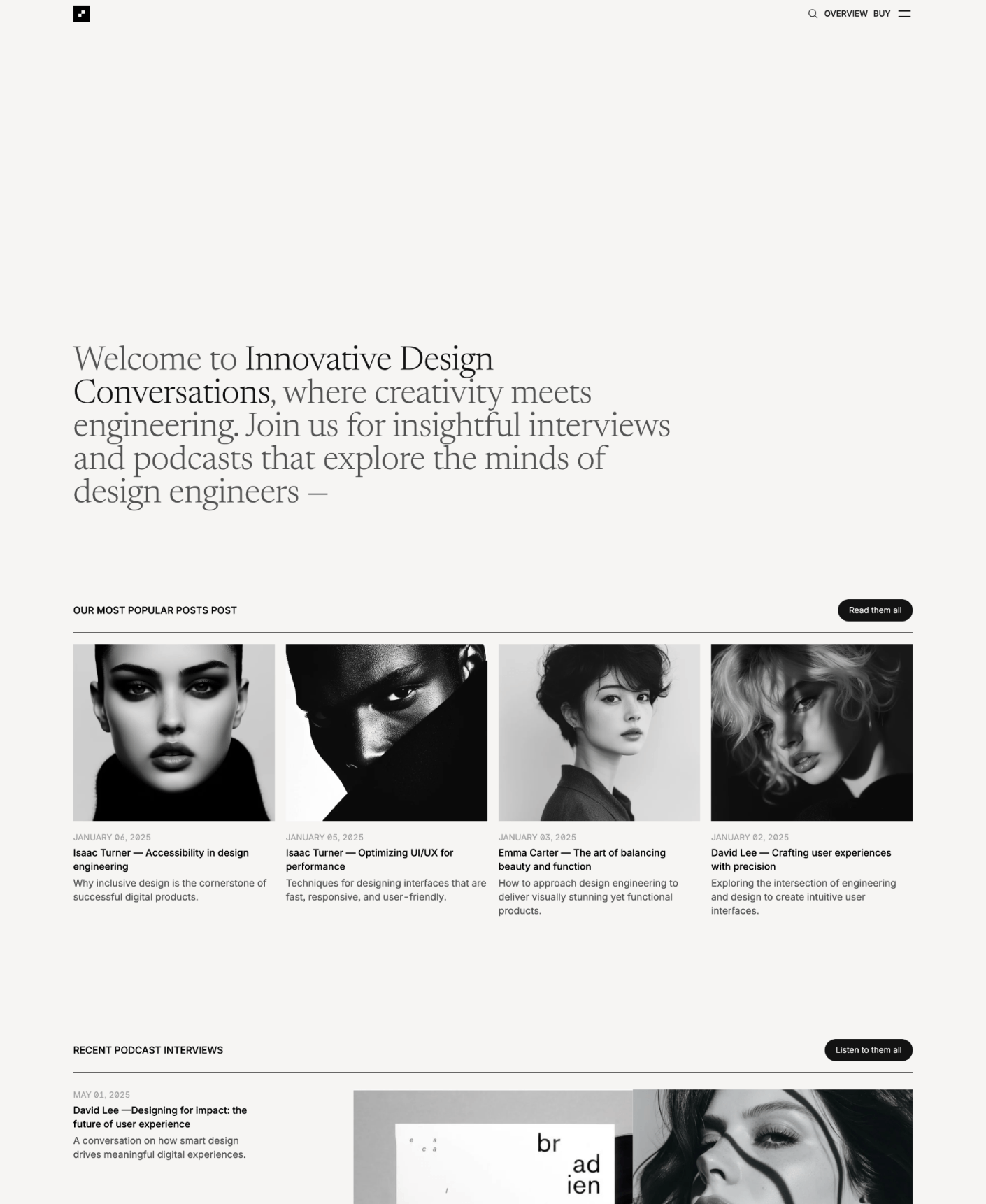 A clean, podcast-ready theme for publishing interviews, articles, and media with clarity and structure. Built for creators, teams, and studios who take their content seriously.