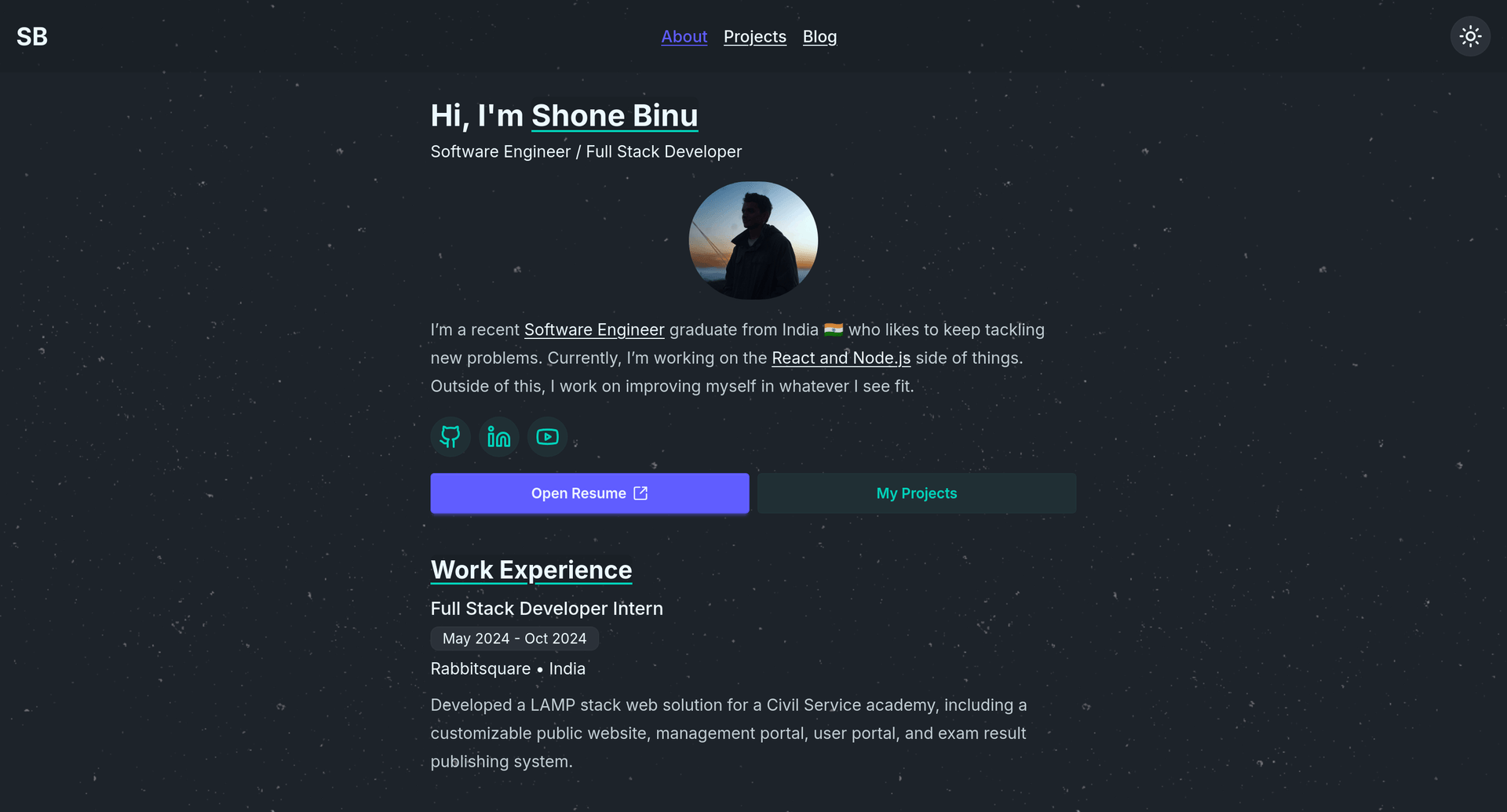 A minimal and beautiful portfolio made using Astro and daisyUI with a stardust background. Includes about(home), projects and blog pages.