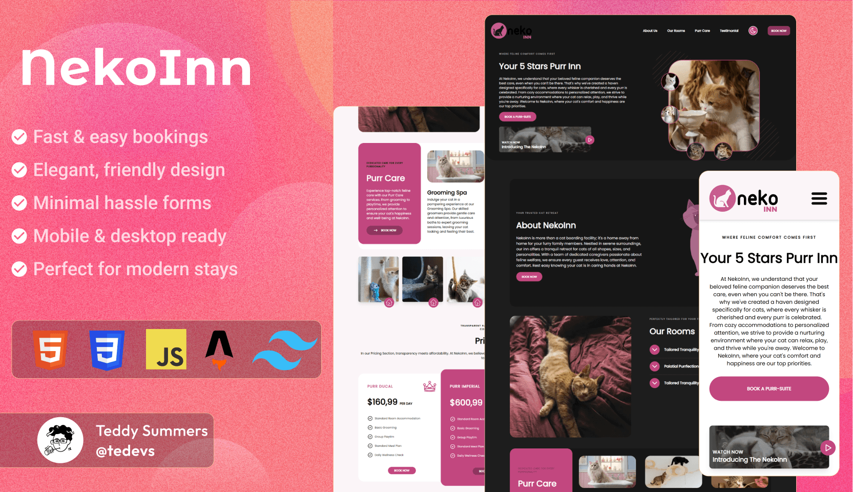 Neko Inn is a premium landing page template built with Astro and Tailwind CSS. Designed with a soft, kawaii aesthetic, it’s perfect for small businesses, creative entrepreneurs, pet-themed projects, or anyone looking to make a memorable first impression with a cozy and charming site. This is not just a design — it’s a fully functional and modular starter template with smooth animations, responsive layout, built-in dark mode, and a working booking form ready to connect with services like Formsubmit.