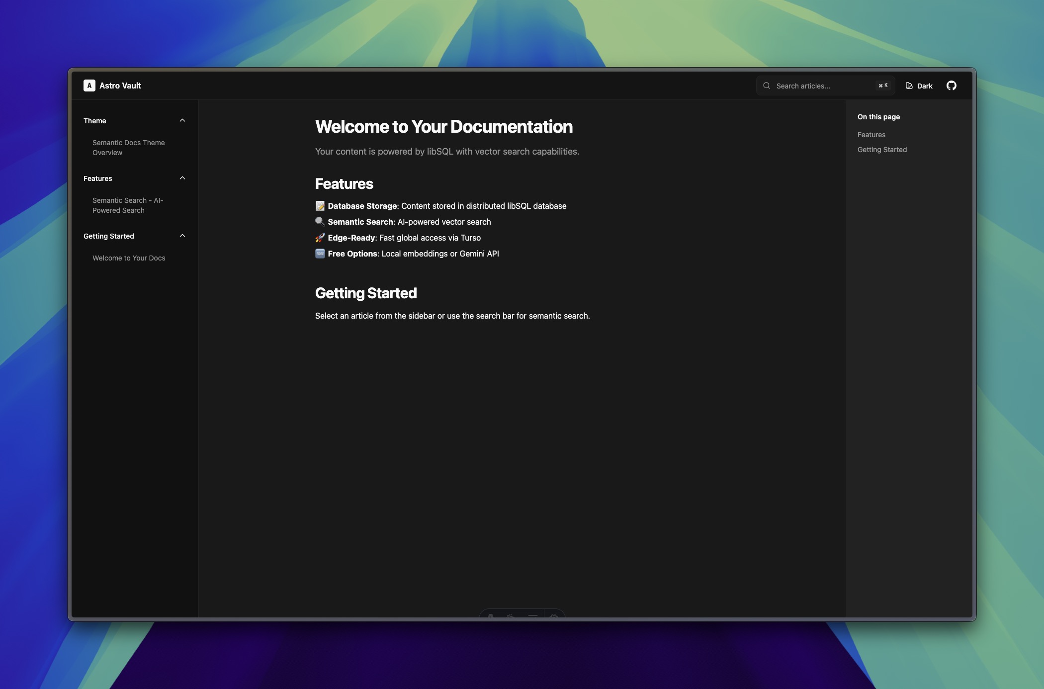 Semantic-docs is a modern documentation theme built with Astro that combines the speed of static site generation with powerful semantic vector search capabilities.