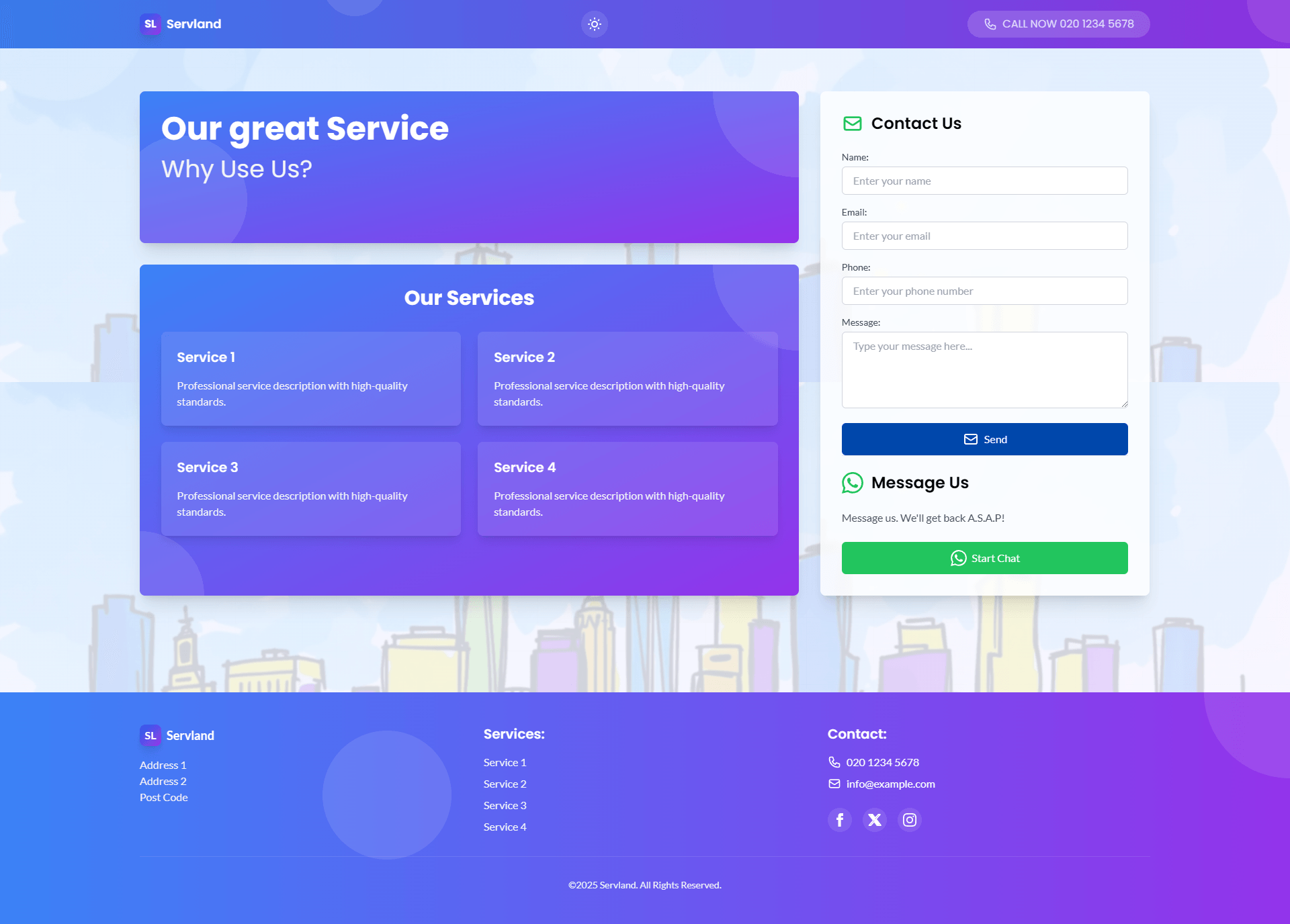 Servland - A modern, responsive business landing page theme powered by Astro 4.0 and Tailwind CSS 3.3. Features include dark mode support, WhatsApp integration, GDPR-compliant cookie consent, parallax effects, and a built-in contact form. Built with TypeScript 6.0 for type safety and better developer experience. Perfect for businesses seeking a professional, fast-loading online presence with modern UI/UX features.